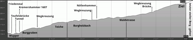 Richtig teuflisch werden die Anstiege aber nicht, man läuft mitten durch ein grosses Waldgebiet unten durchs Burgholzbachtal - eigentlich eher idyllisch. Damit man sich diese letzten "grausamen" 3km mental schonmal besser einteilen kann, hilft vielleicht obige Grafik. Am Nöllenhammer hat man die Hälfte schon geschafft!
